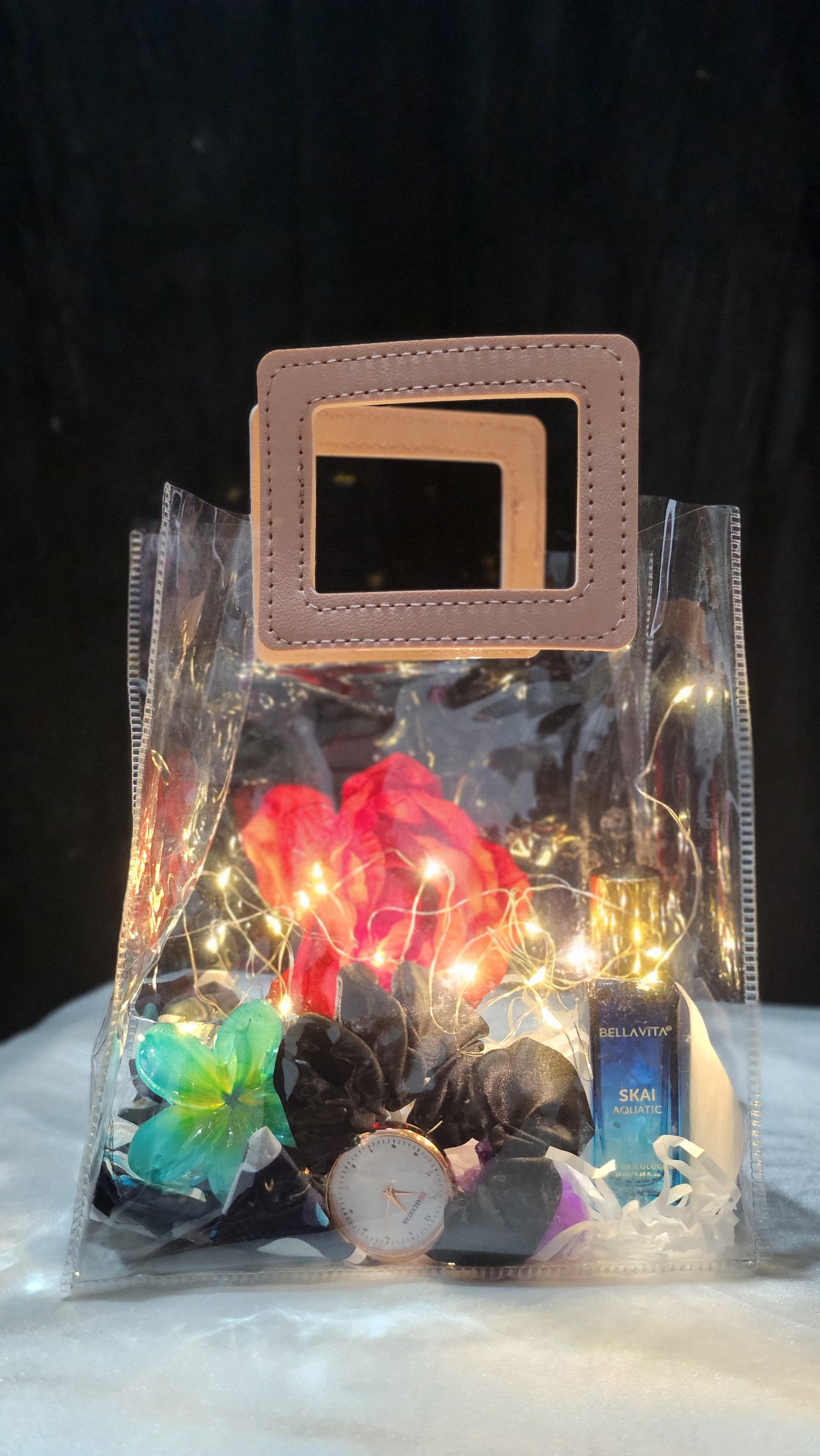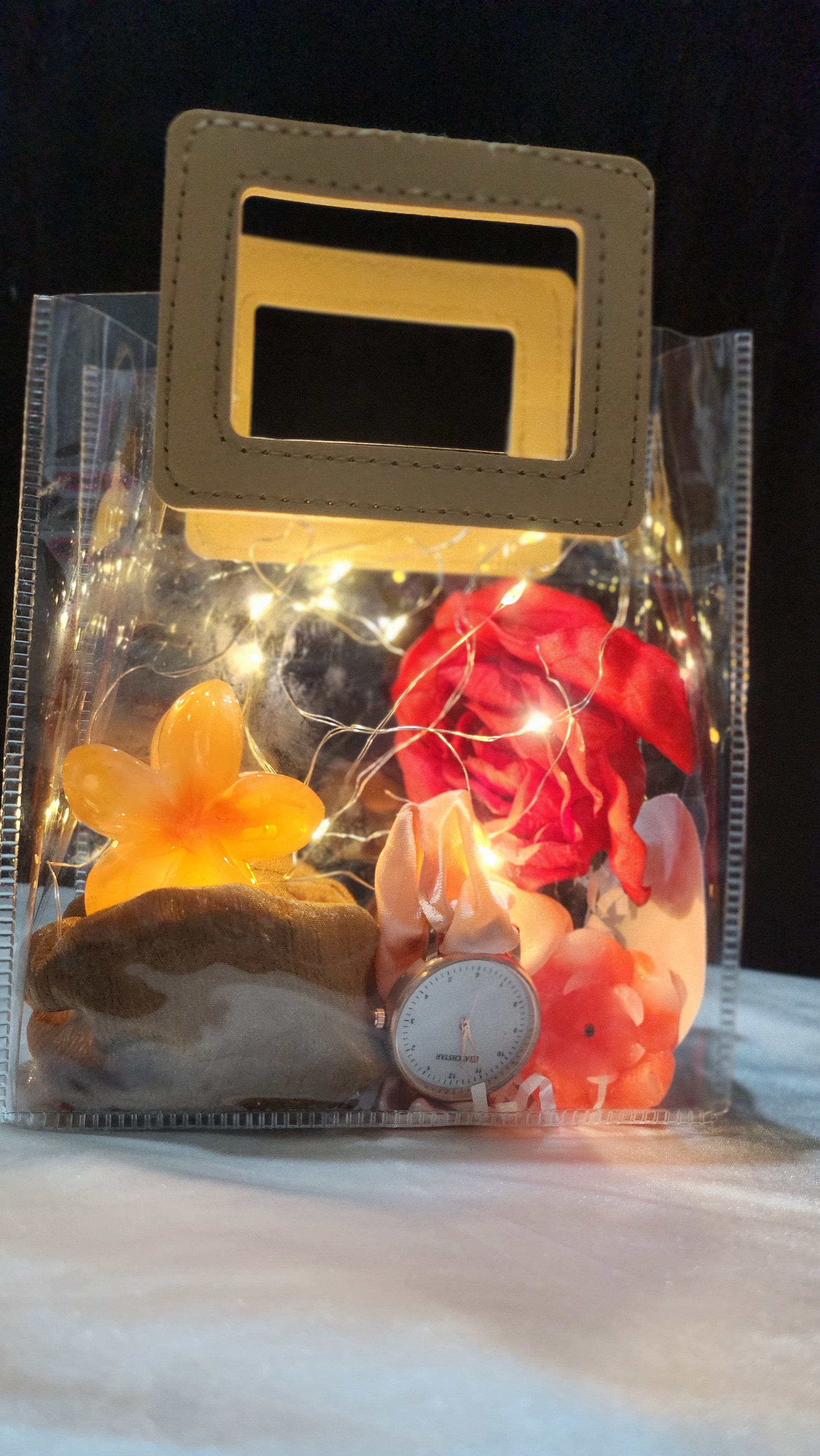 Whether it’s a birthday, an anniversary, or a "just because" gift, this is more than just a present—it's a moment captured in a beautiful, wearable display. The durable, transparent bag with its chic leather-look handle is perfect for storing small treasures, or simply for showcasing its beautiful contents.