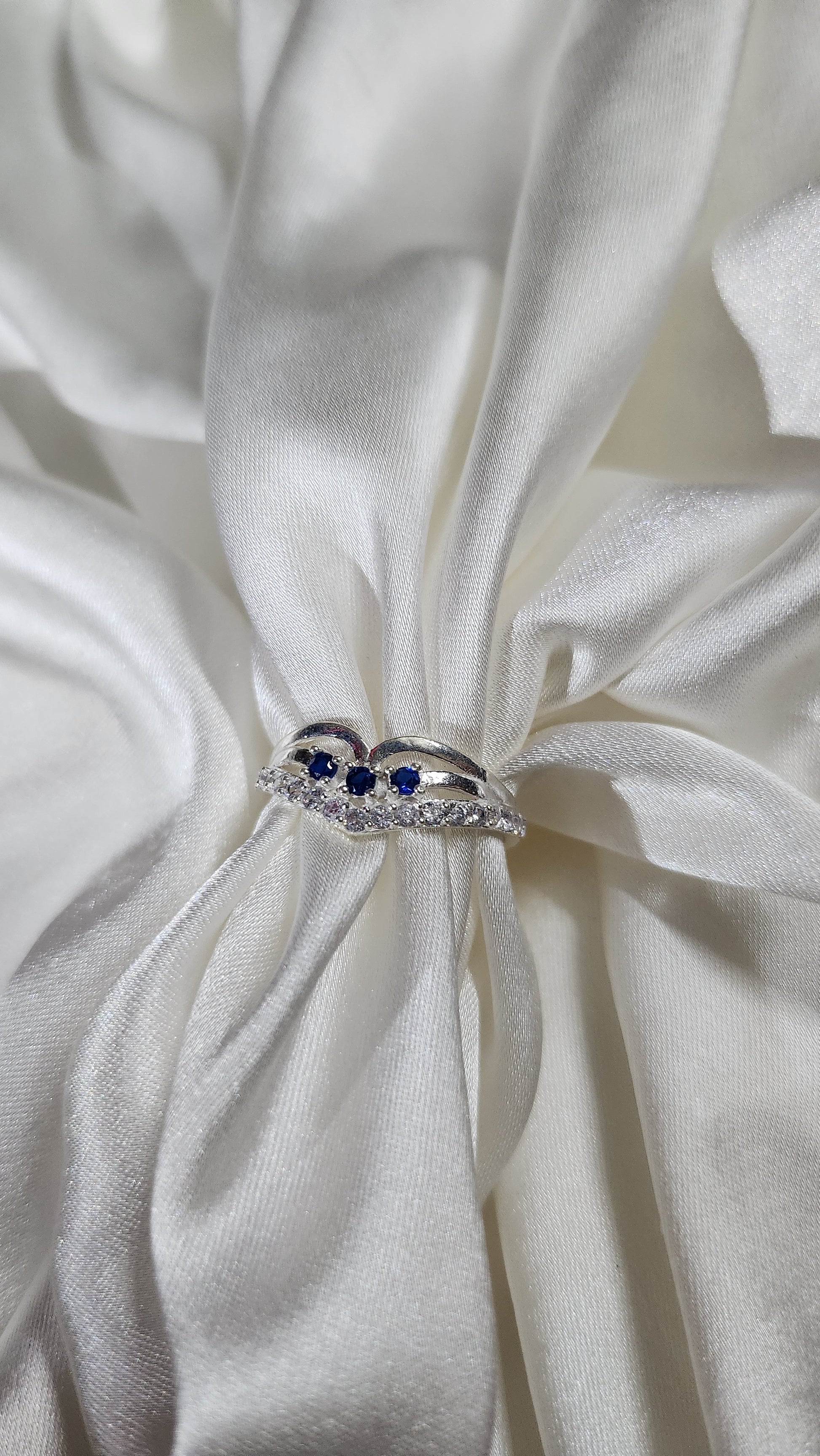 Capture attention with this beautiful silver-toned multi-row ring. The intricate design is crowned by three rich blue sapphire-colored stones, flanked by rows of shimmering clear accent stones (CZ).